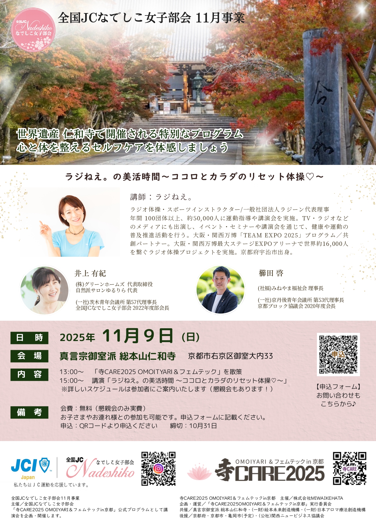 部会員・JC 関係者のつながりを深めて、楽しいひと時を過ごしていただくこと、そして、フェムテックケアの重要性を再確認してもらうこと。この2点を主な目的として、京都にて事業を開催させていただきます。お忙しいとは存じますが、1人でも多くのご参加をお待ちしております。